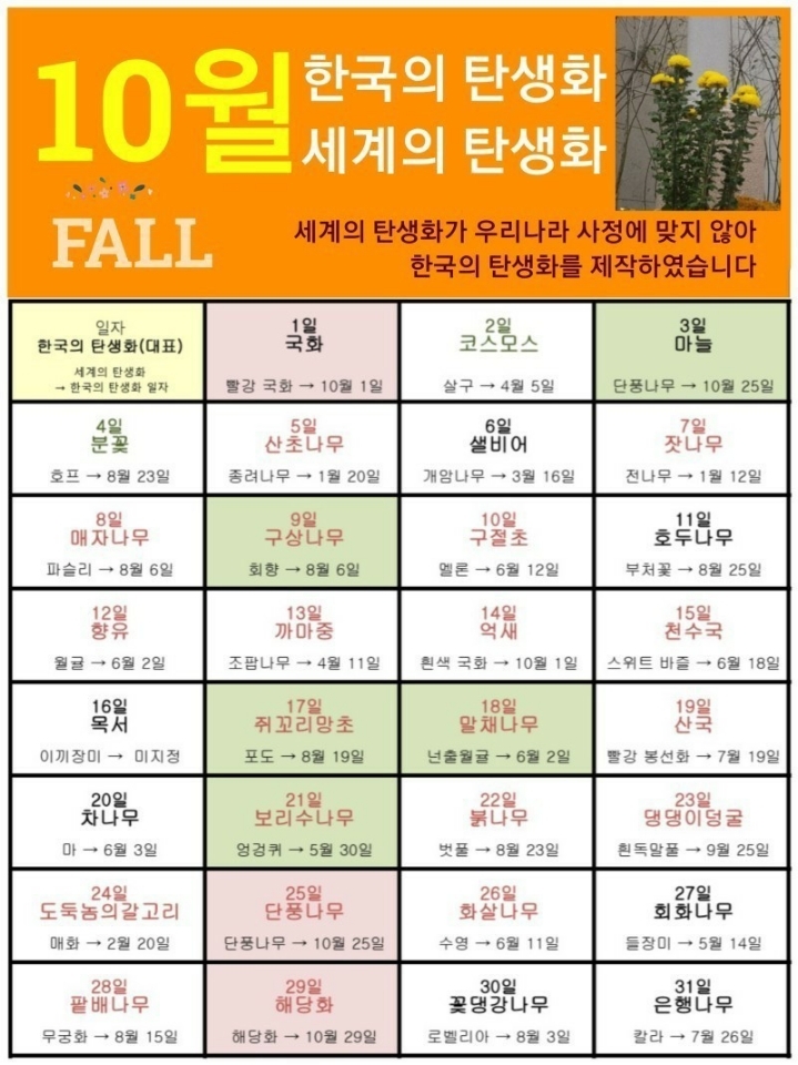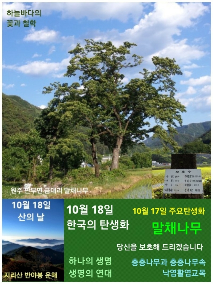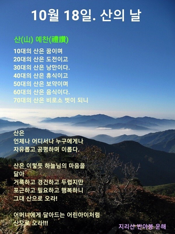 오늘은 산림청이 재정한 [산의 날]입니다. 우리나라의 산이 가장 아름다운 10월, 단풍이 짙어지기 시작하는 한로(寒露)와 산에 올라 풍류를 즐기는 우리전통의 세시풍속인 등고(登高)가 행해지던 음력 9월 9일 중양절에 인접한 날에서 「십(十)+팔(八)=나무(木)」의 상징적 의미를 살려 매년 10월 18일을 「산의 날」로 정하게 되었습니다.