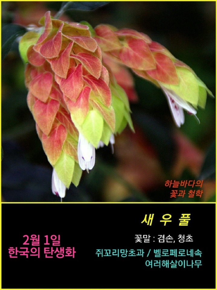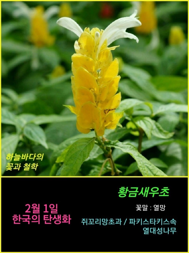 꽃과 꽃받침이 어울린 모양이 새우를 닮은 [새우풀]과 [황금새우초]는 쥐꼬리망초과 가문으로 온실에서 사철 개화합니다. 이 아이들의 고향은 중남미와 열대 아메리카입니다.