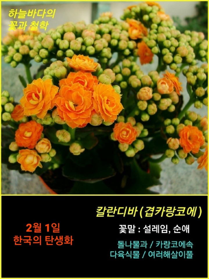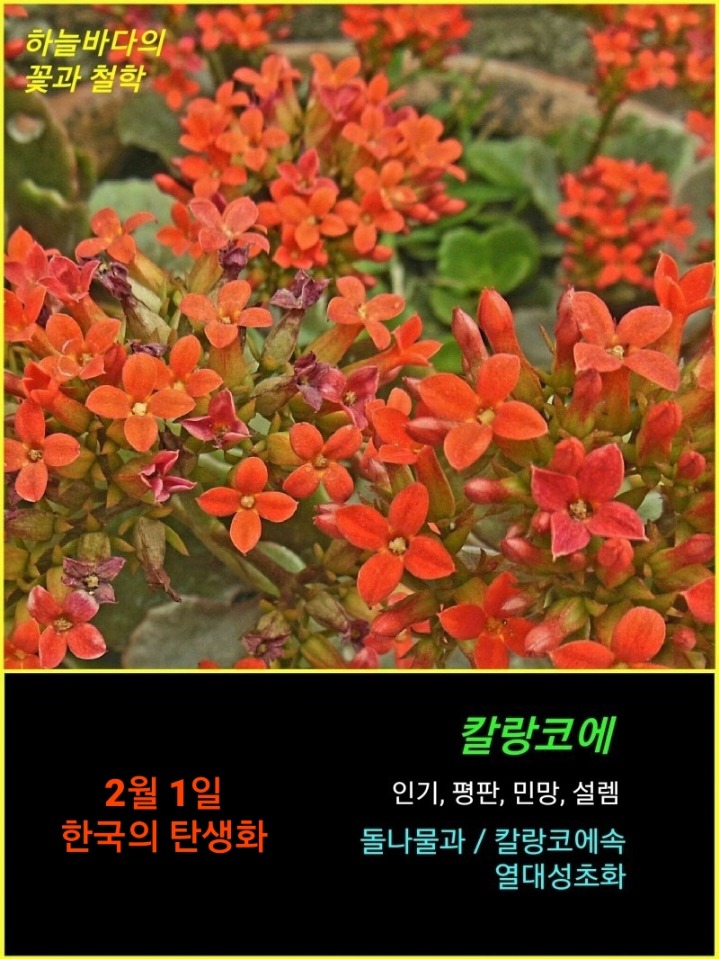 [칼랑코에]는 아프리카가 원산인 돌나물과 식물로 비교적 추위에 강해 2월부터 5월까지 늦겨울과 봄에 걸쳐 피는 꽃과 가을부터 초겨울까지 피기도 합니다.