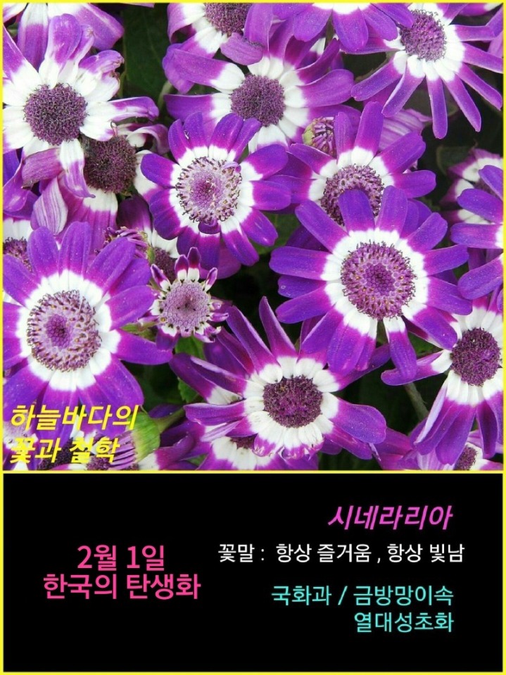 국화 가문의 [시네라리아]는 아프리카 북서부에 있는 카나리섬에서 온 아이로 12월부터 4월까지 한 겨울에 실내 개화하고 꽃이 진 후 열매가 떨어진 모양이 마치 해골을 닮아 엽기 식물로 소개되기도 합니다.