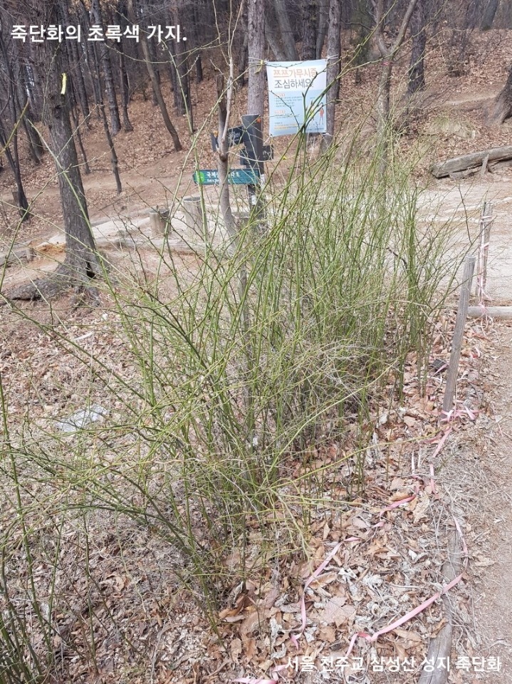 [황매화]는 꽃잎이 다섯장으로 색깔만 빼고는 매화꽃을 닮아 노란 매화꽃이란 의미로 [황매화]가 되었습니다. 매화와는 같은 장미과이긴 하지만 제법 먼 친척지간 이랍니다. 나무의 크기도 다 자라봐야 사람 키만하고 무엇보다도 개나리처럼 가지가 가늘어서 사군자의 으뜸으로 귀하게 대접받는 매화와는 많이 다르답니다. 가지의 색깔이 녹색인 것이 특징인데 겨울에 잎이 없을 때 녹색의 가는 가지들이 옹기종기 모여있으면 황매화나 죽단화 가지일 가능성이 높답니다.