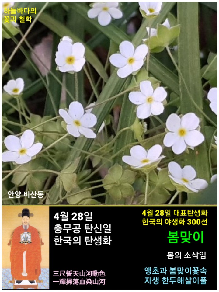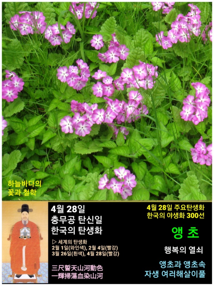충무공탄신일인 오늘 한국의 탄생화는 [봄맞이]와 [앵초]입니다. [앵초]의 세계의 탄생화가 오늘인지라 같은 [앵초과]인 [봄맞이]와 함께 한국의 탄생화로 정했습니다. 마침 어제 성공적인 남북정상회담을 통해 우리 겨레에 새로운 봄이 시작되었습니다. 오늘의 탄생화인 봄맞이꽃과 함께 모든 꽃과 나무들도 한반도에 찾아온 평화의 봄을 함께 축하합니다.