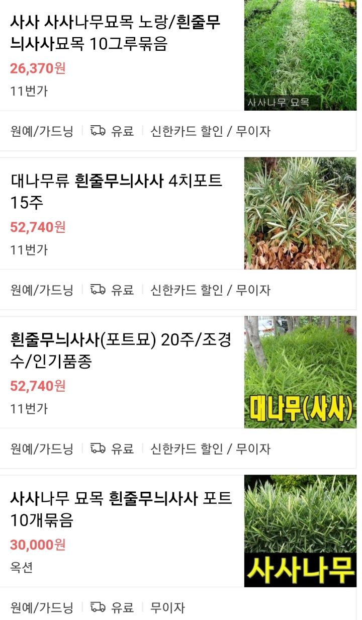 또 조릿대와 거의 구분이 안가는 사사 종류도 있는 데, 그 중 잎의 가운데에 흰줄이 있는 [흰줄무늬사사]가 조경용으로 많이 사용되고 있습니다. 가격을 보니 10주 묘목이 대략 3만원에 팔리고 있습니다.