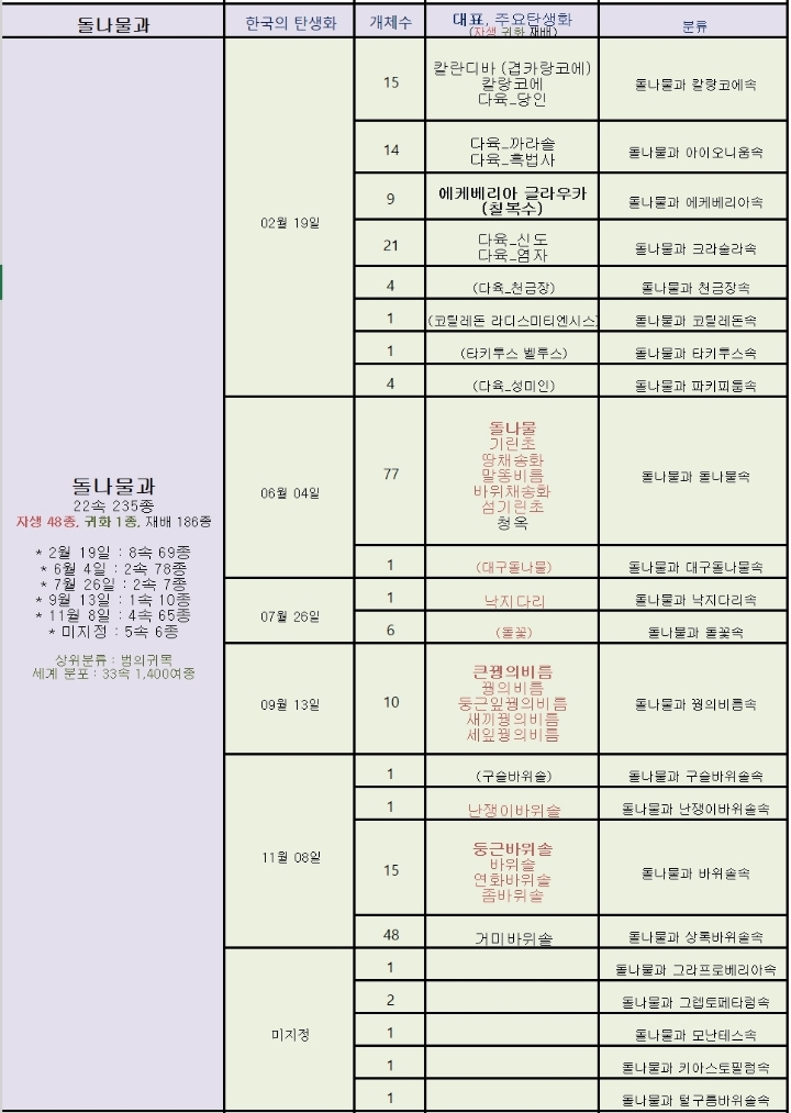 오늘 한국의 탄생화는 돌나물과의 상록 다육 식물 모듬입니다. 굉장히 종류가 많아 일일이 다 열거할 수도 없습니다. 지금은 돌나물과에만 8속에 69종이 등재되어 있지만 원예 기술이 발달하여 앞으로도 수 없이 많은 종류의 다육이가 생길 것입니다. 다육식물은 특히 `돌나물과`와 `선인장과`에 많은데 선인장과의 다육이는 선인장의 한국의 탄생화(7월 29일)에 넣고, 돌나물과 다육이들의 탄생화를 오늘로 정하도록 하겠습니다.
