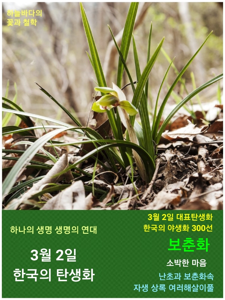 3월. 어제는 [민주공화국 대한민국의 시작]의 의미가 있는 [삼일절]이라 특별한 공휴일이었고 실제적으로 삼월의 첫날인 오늘, 봄의 시작을 대표하는 한국의 탄생화는 난초의 한 종류인 [보춘화]입니다. 흔히 [춘란]으로 불리며 우리나라에서 자생하는 몇 남지 않은 야생난초입니다. 세계적으로는 [난초과]에 속한 식물의 종류가 가장 많습니다. 대부분 아열대지방에 분포합니다.