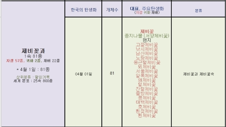 제비꽃과에는 제비꽃속 밖에 없습니다. 그러나 제비꽃속에는 자생종 57종, 귀화종 2종, 재배종 22종 등 모두 81종의 적지 않은 식구들을 거느리고 있답니다.