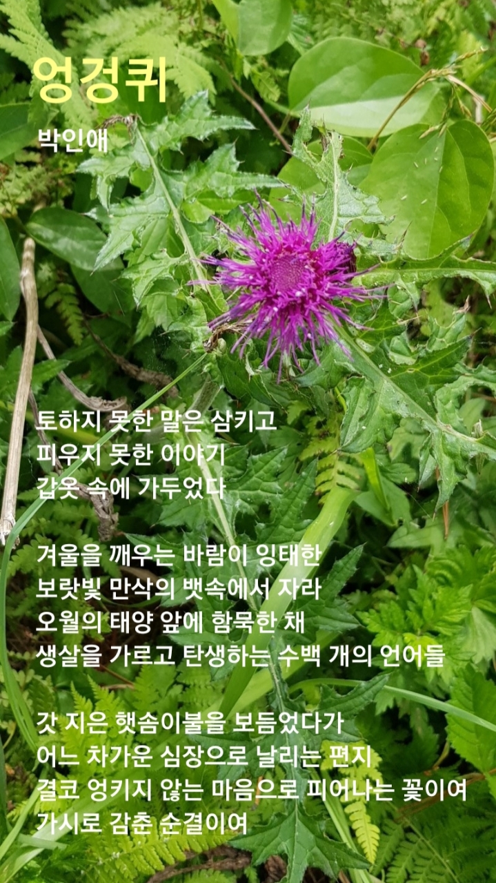 멋진 시로 시작하는 5월 30일의 아침입니다. 시인은 같은 꽃을 보더라고 바라보는 관점이 달라 우리는 느끼지 못한 상상과 감흥이 생기는가 봅니다. 박인애 시인의 눈에는 보랏빛 화관의 엉겅퀴 꽃이 피어나는 모습이 태양의 에너지를 받아 태어나는 모습으로 비춰졌나 봅니다. 꽃이 벌어지는 모습은 생살을 찢는 고통과 환희로, 그리고 그 거룩한 탄생을 지키는 엉겅퀴 가시의 역할은 함부로 밟히지 않으려는 순결한 몸부림으로 느껴진 듯 합니다. 이 아름다운 시는 가곡이 되고 시낭송의 소재가 되어 멋진 옷을 입었습니다.