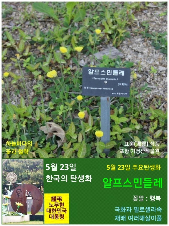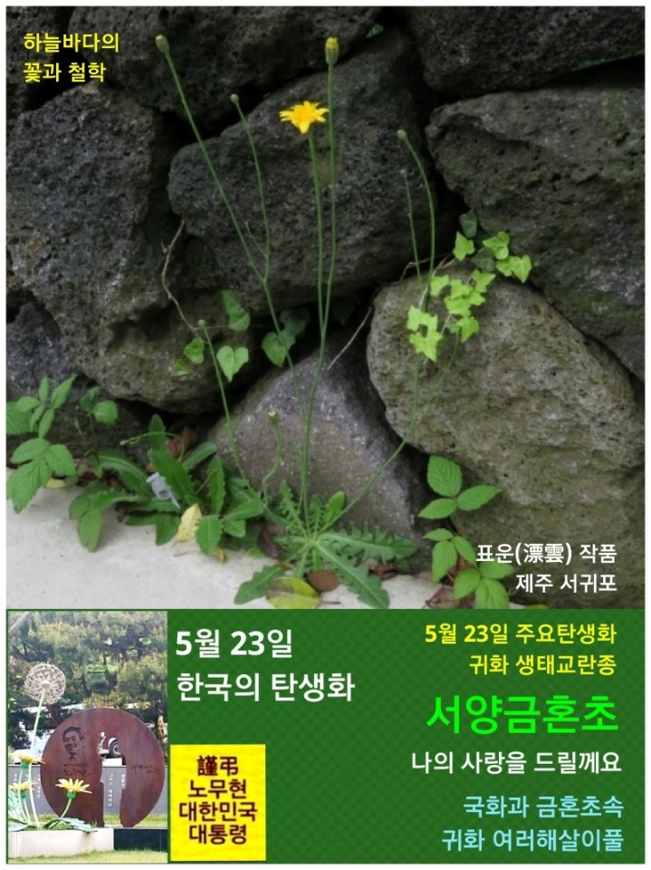 오늘 한국의 대표탄생화는 [민들레]입니다. 11년 전 돌아가신 대한민국 대통령 노무현 대통령을 상징하는 꽃이고, 그 분을 추모하기 위함입니다. 그 분의 이름 앞에 [故]자를 붙이지 않은 이유는 그 분은 생명의 강을 건너가셨지만 저는 아직 그 분을 보내드리지 못한 까닭입니다.