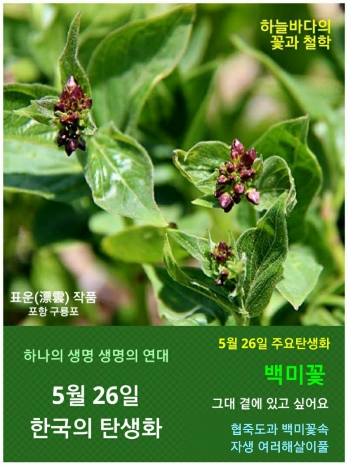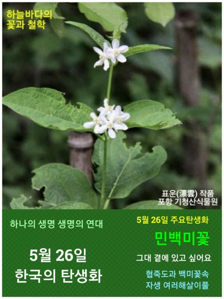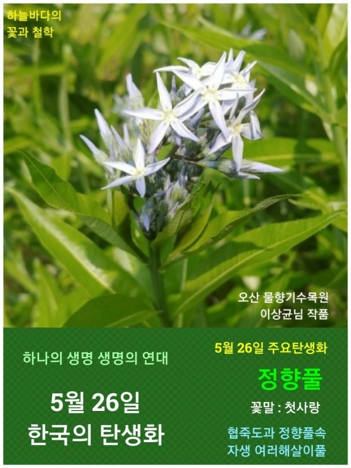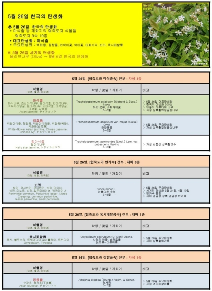 오늘 한국의 탄생화는 [협죽도과] 식물 중 요즘 개화기를 맞은 식물들입니다. 처음 한국의 탄생화를 정할 때 오늘은 [백미꽃] 등 [박주가리과] 식물들의 한국의 탄생화 날로 정했었으나 새로 개정된 '국가생물종 지식정보 시스템'에 [박주가리과]가 [협죽도과]로 통합되어 [마삭줄], [백화등] 등 [협죽도과] 식물들을 통합하여 오늘 한국의 탄생화로 재편하였습니다.