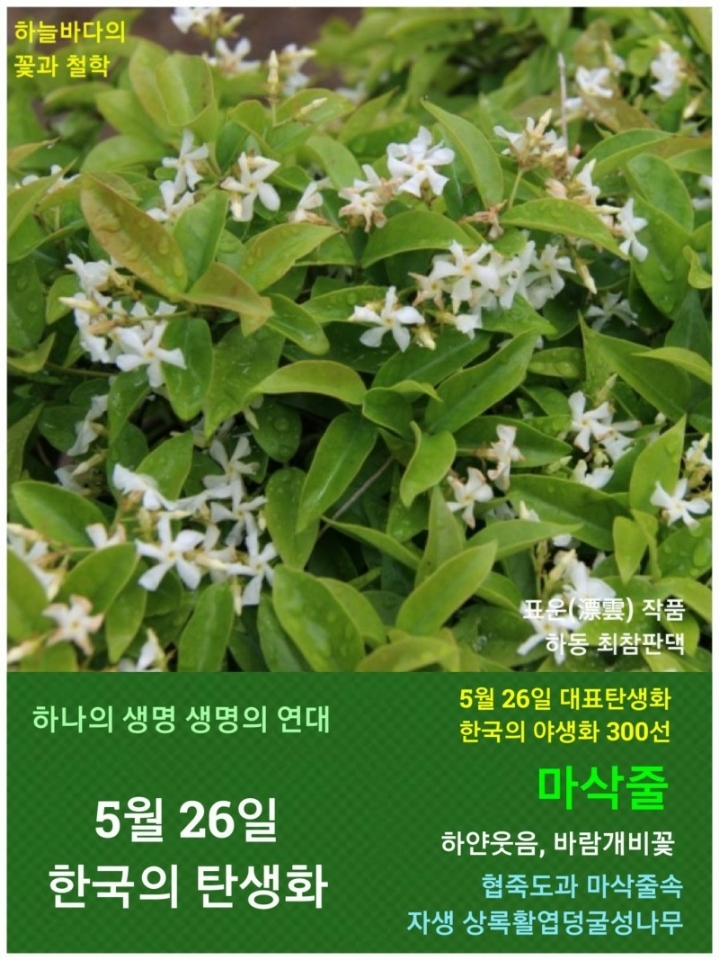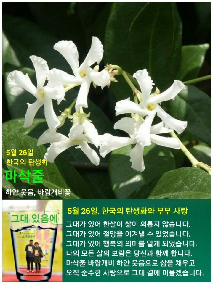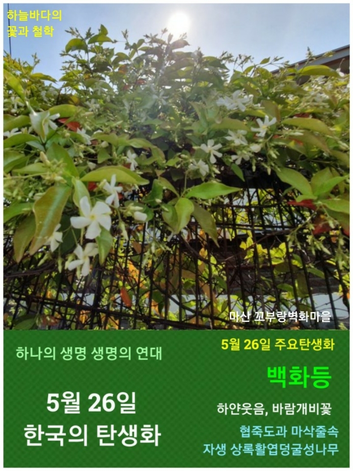 이 중 오늘의 대표 탄생화는 [마삭줄]입니다. 남부지방에서 자생하는 덩굴식물입니다. 우리 선조들은 그 덩굴로 줄을 만들어 썼던 모양입니다. 꽃은 지금 이맘때 하얀 꽃이 피는데 4장의 꽃잎이 마치 바람개비 같아 꽃말이 하얀미소, 바람개비꽃입니다. [마삭줄]은 음지를 좋아하는데 비슷하게 생긴 [백화등]은 양지를 좋아하는 덩굴식물입니다. 그러다보니 꽃 모양은 [마삭줄]과 비슷하지만 조금 더 크게 자란답니다. 작년 5월 5일 마산의 꼬부랑벽화마을을 방문했을 때 담을 타고 오르던 백화등이 너무 아름다워 한동안 넋을 놓고 감상하였답니다. 향기도 아주 그만인 꽃입니다.