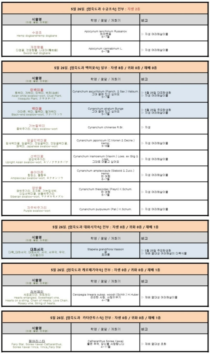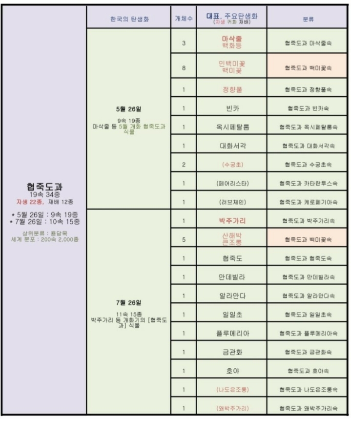 [협죽도과]는 19속 34종의 식물이 한국의 탄생화 목록에 등재되어 있는 비교적 작은 가문입니다. 이 중 요즘이 개화기인 마삭줄, 백화등, 백미꽃 등 9속 19종은 오늘 한국의 탄생화로, 한 여름에 꽃이 피는 박주가리 등 11속 15종은 7월 26일의 한국의 탄생화 정하였습니다.