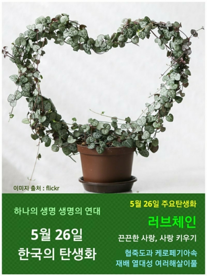 또 이름이 사랑스러운 [러브체인]도 [협죽도과] 식물입니다. 꽃보다는 잎을 보고 키우는 식물인데 잎이 작은 하트모양으로 생겼으며 체인처럼 늘어져 [러브체인]이라 불립니다. 꽃말은 이름과 걸맞게 '끈끈한 사랑, 사랑키우기'입니다.