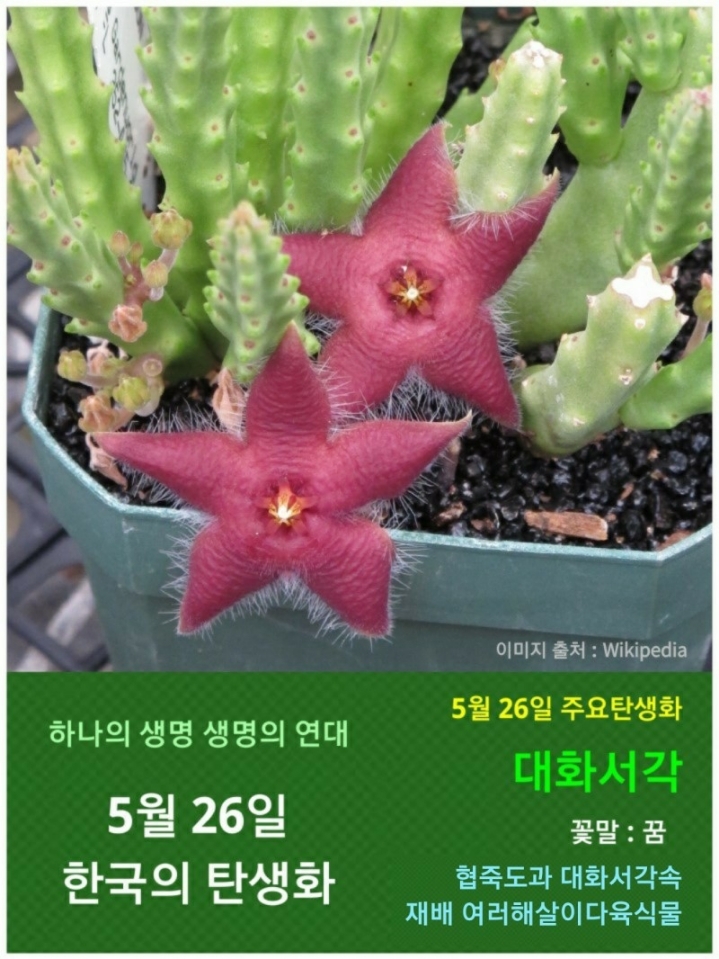 이밖에도 다육식물로 꽃집에서 만날 수 있는 [대화서각]도 오늘의 탄생화입니다. 한자어인데 꽃이 덩치에 비해 커, 큰 꽃의 '대화'란 이름으로, 커다란 별 모양이라 속명인 스타페리아(stapelia)로 불리기도 합니다. 어떤 아이는 꽃의 크기가 본체의 크기보다도 더 큰 아이들도 있습니다. 별이 꿈을 상징해서민지 꽃말도 '꿈'입니다.