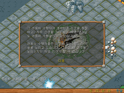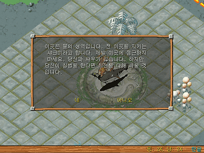 8. 물의 동굴 지하 2층에서 등장하는 괴상어(Lv40)와 전투하여 물의 성역 열쇠를 획득한 뒤, 물의 성역 석상(91, 89)와 대화하여 3층으로 이동한다.