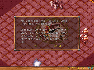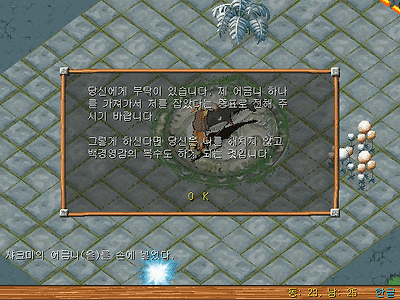 14. 샤크미에게 해독약, 봉인의 열쇠, 물의 성역 열쇠를 건네주고 두꺼운 담쟁이 덩쿨(끈의 성분9)과 물의 신물의 축복(공+3 민+5, 매력 +10 물의 정령 Lv2), 5000 경험치를 받는다.