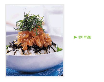 ● 이렇게 만드세요 ● ① 참치는 잘게 다진 뒤 분량의 참기름과 깨소금을 넣고 젓가락으로 섞는다. ② 그릇에 밥을 담고 잘게 자른 김과 양념한 참치, 깻잎 채를 차례로 올린다. ③ 만들어 놓은 양념장을 밥 위에 뿌려 먹는다.