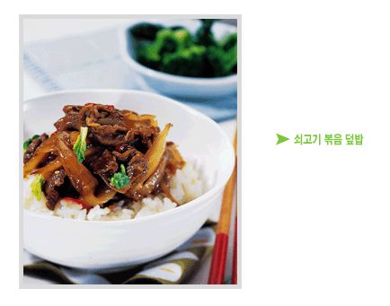 ● 이렇게 만드세요 ● ① 달군 팬에 식용유를 두르고 채 썬 양파를 연한 갈색이 날 정도로 볶다가 양념장을 넣고 끓인다. ② ①에 쇠고기를 뭉치지 않도록 한두 장씩 펴서 넣고 끓이다가 고추와 양배추를 넣는다. ③ 거품을 걷어내고 고기가 익으면 불을 끈 뒤 그릇에 밥을 담고 그 위에 쇠고기 볶음을 푸짐하게 올린다.