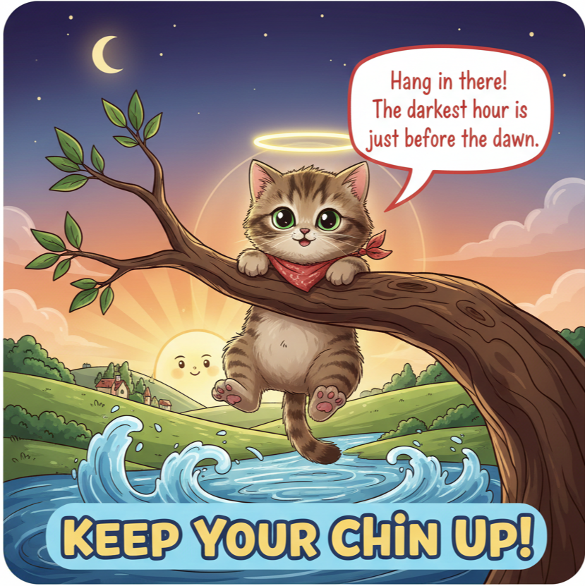 - 설명 : 이 표현을 생각할 때 미국인들이 가장 먼저 떠올리는 이미지는 '나뭇가지에 매달린 고양이' 포스터입니다. 1970년대에 유행했던 포스터로, 새끼 고양이가 나뭇가지에 간신히 매달려 있는 사진 아래 "Hang in there, Baby!"라는 문구가 적혀 있었죠.