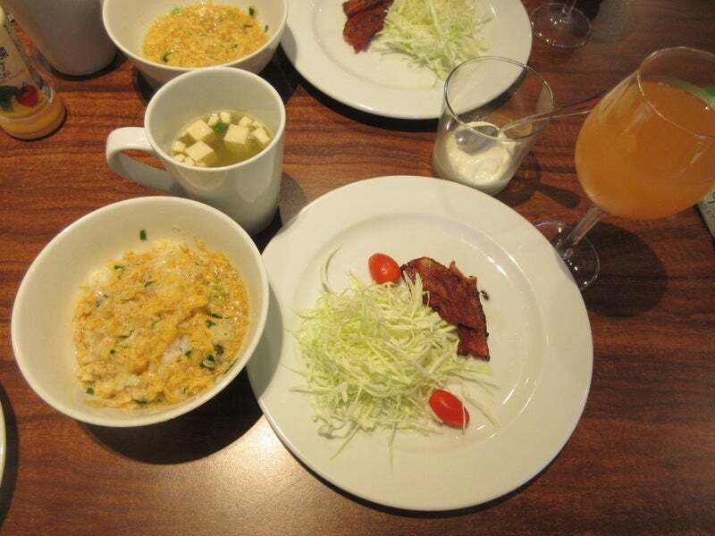 오늘아침은 간만에 밥을 먹었네요. 계랸덮밥에 양배추 샐러드와 베이컨.