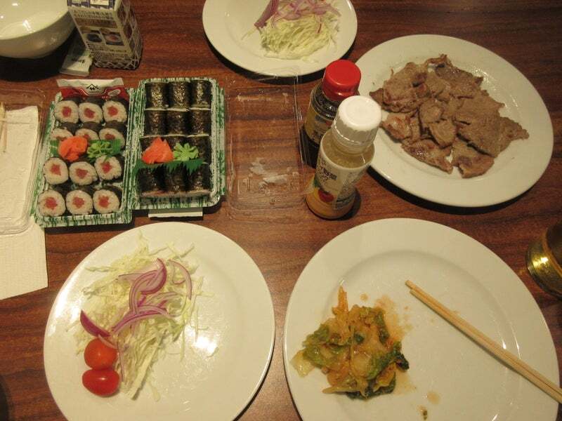 아일랜드 컨트리 마켓에서 구입한 김밥과 BBQ 돼지고기, 샐러드와 김치.