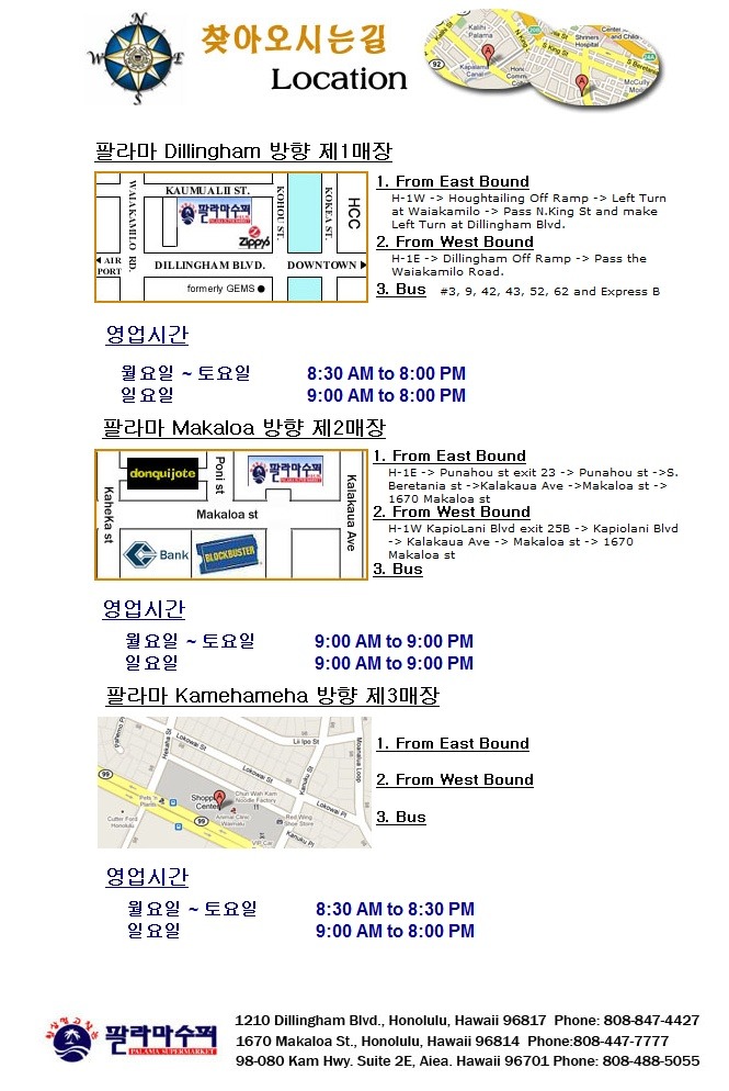 와이키키 외곽의 시내에 한곳과, 공항에서 약10분거리의 매장을 포함해서 총3개의 매장을 호놀룰루에 운영을 합니다.