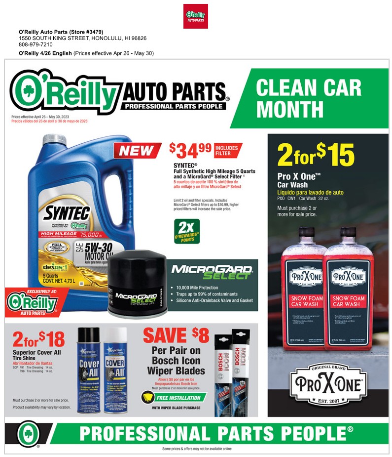 [ 하와이 생활상점 ] "O'Reilly Auto Parts"(차 부품/용품) :: 세일정보 - 2023년 4월 26일 ~ 5월 30일