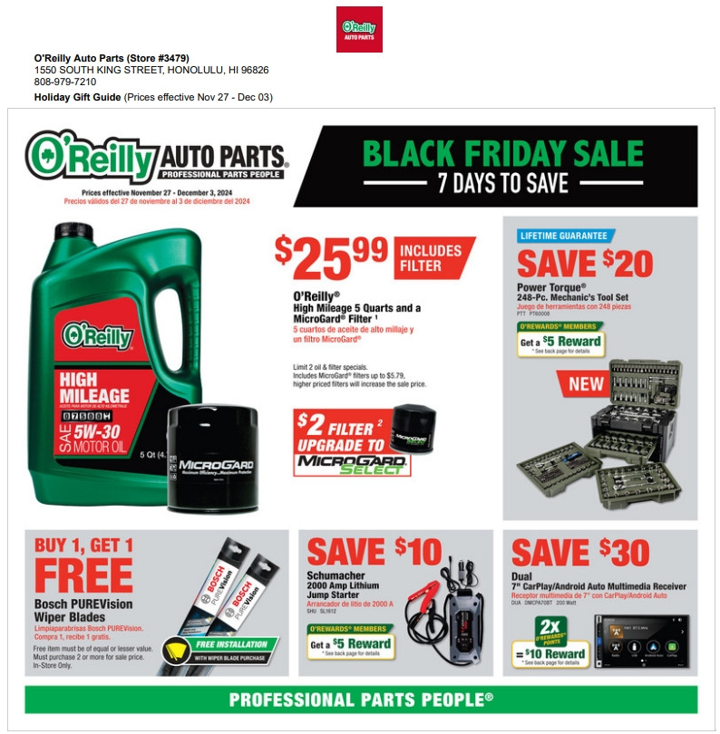 [ 하와이 생활상점 ] "O'Reilly Auto Parts" :: Black Friday - 2024년 11월 27일 ~ 12월 3일