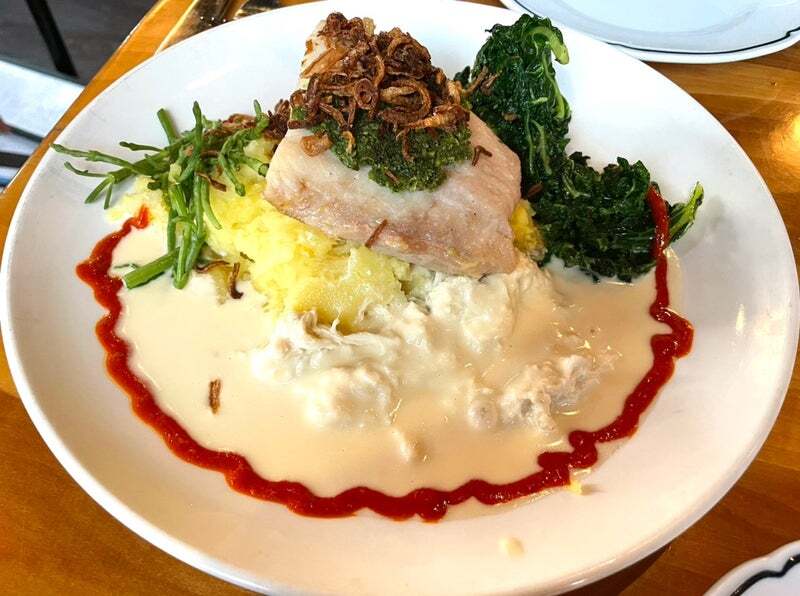 메인으로 주문한 생선요리 입니다. 케일과 아스파라거스 으깬 감자가 크림소스와 함게 제공이 됩니다.