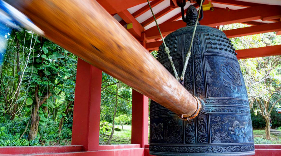 높이 5피트(1.5미터)에 무게 3톤인 놋쇠종을 울리려면 슈모쿠라고 하는 당목을 뒤로 당겼다 놓아야 합니다.