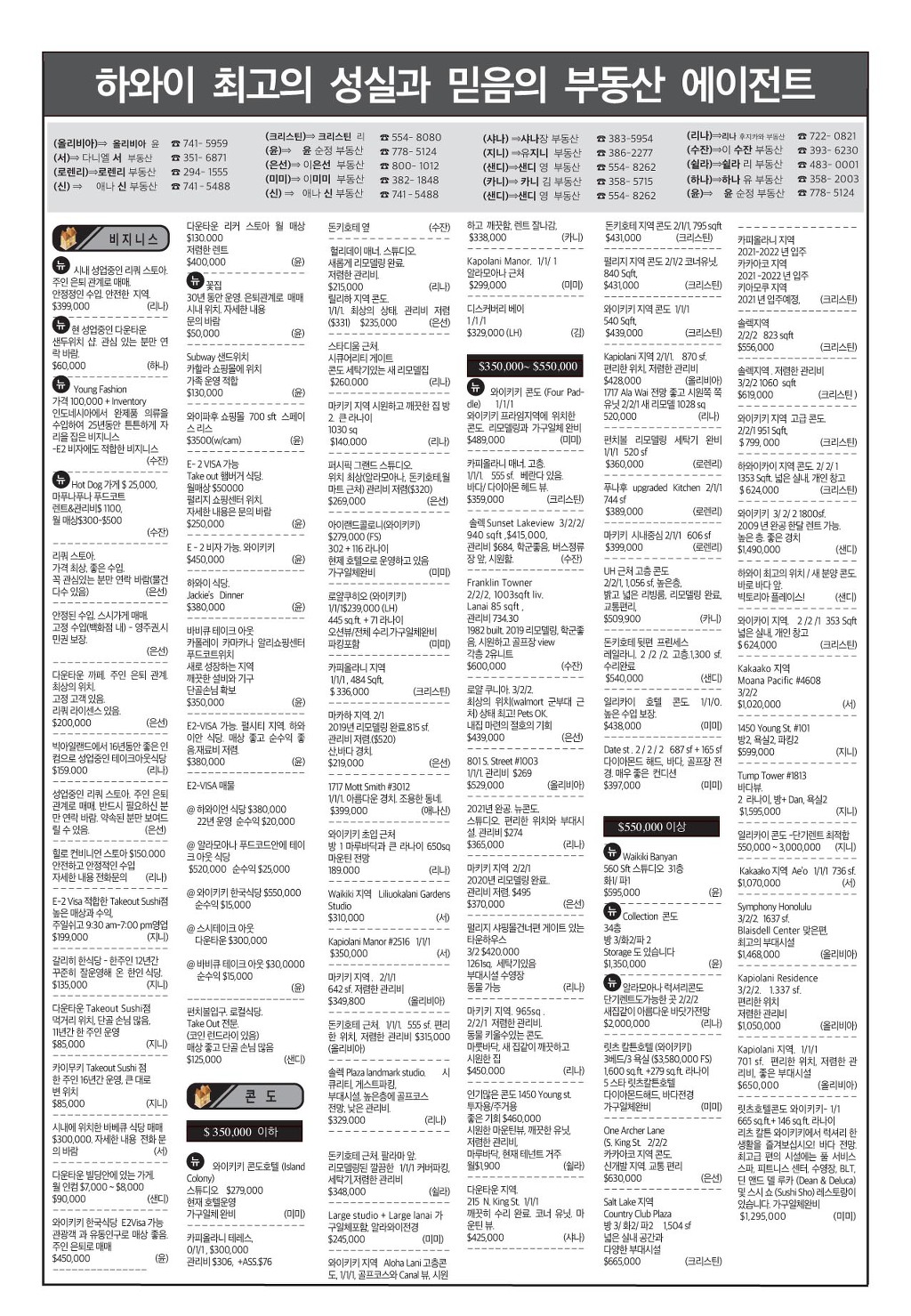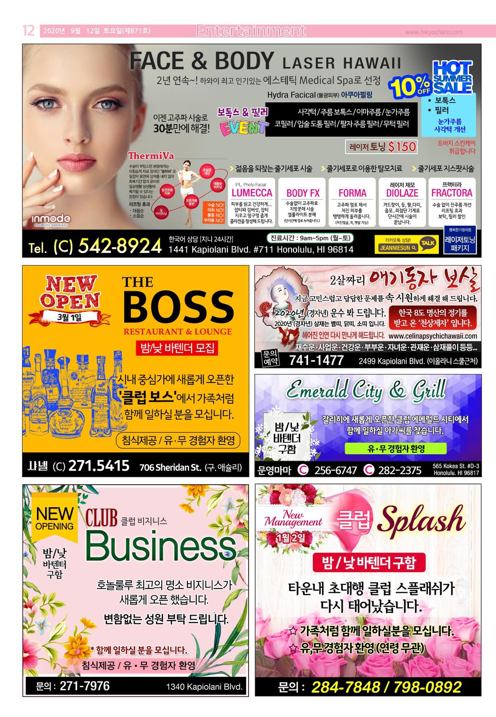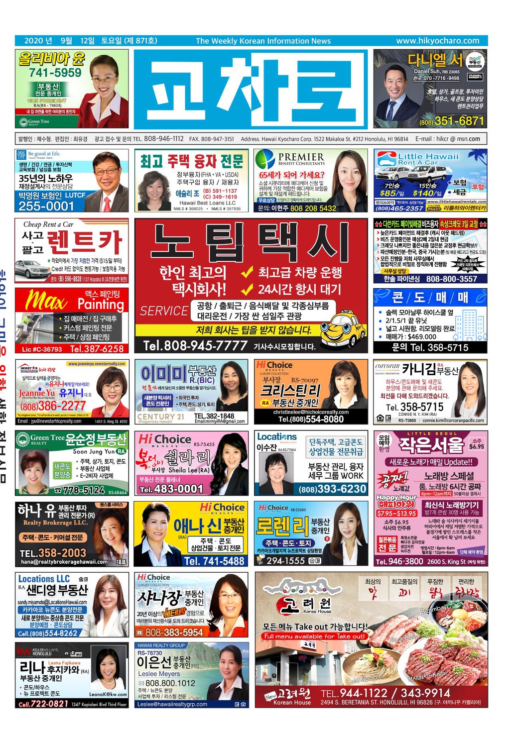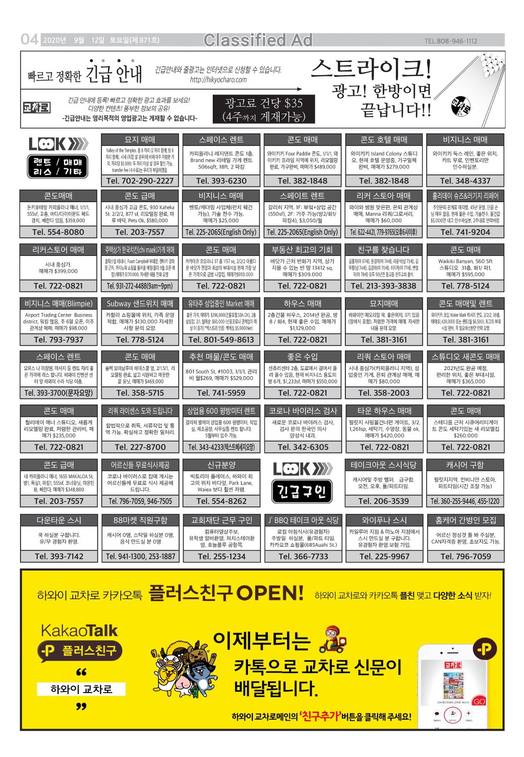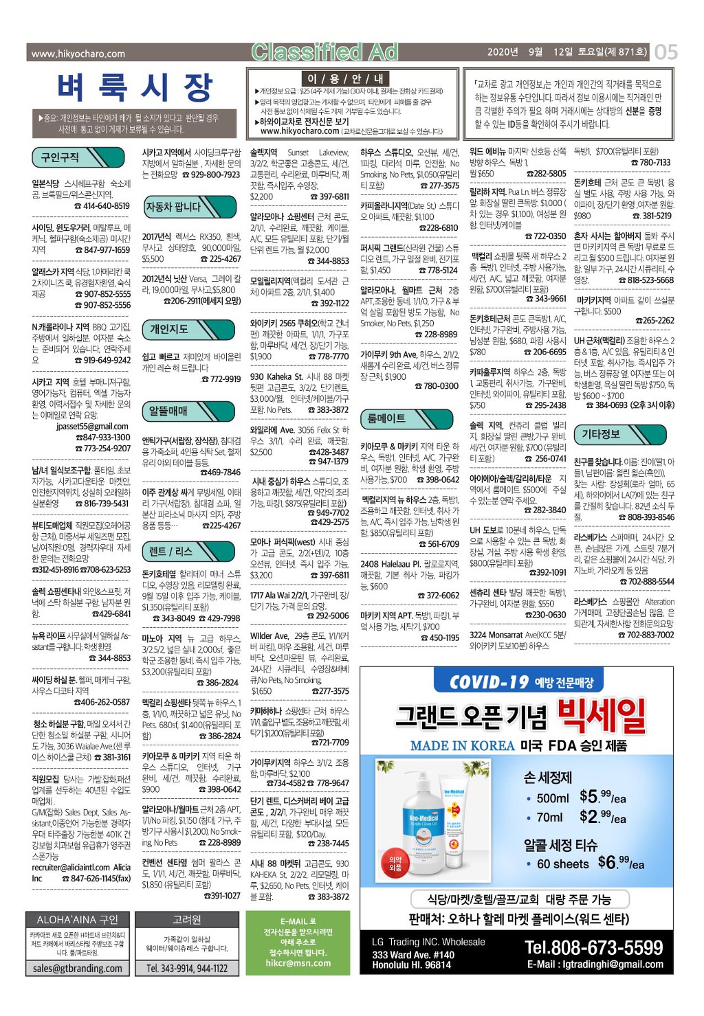 [ 하와이 교차로 :: 2020년 9월 12일(토) ] 구인/구직, 벼룩시장, 렌트(아파트/룸메이트), 부동산, 매매(사업체/자동차), 민박/콘도, 지역광고등..
