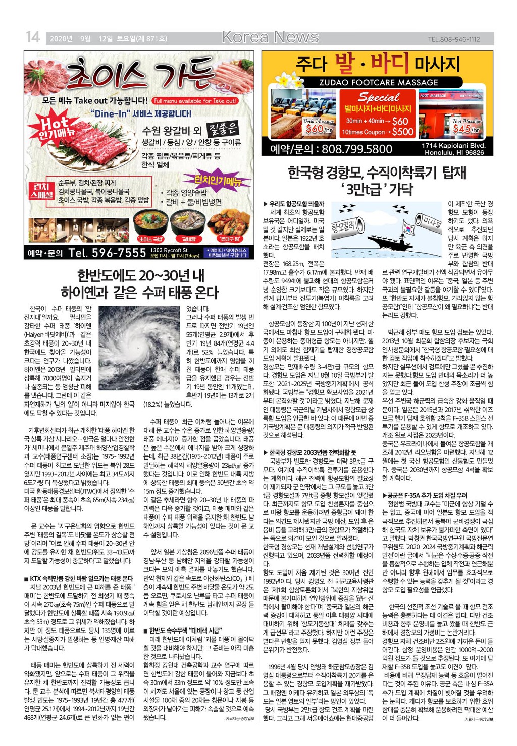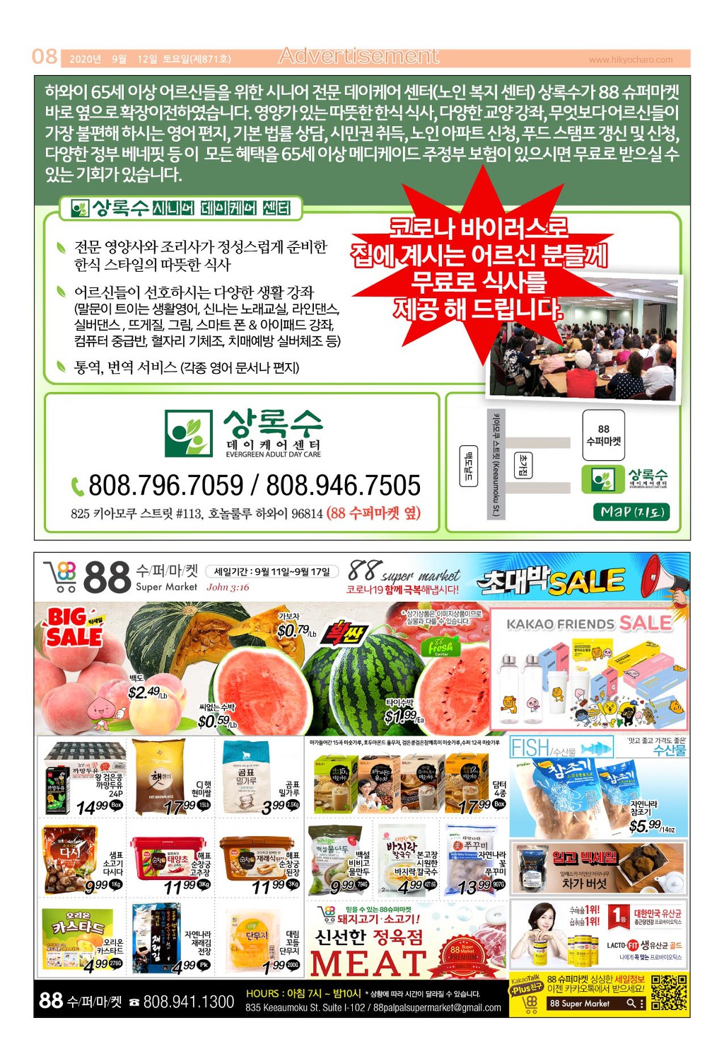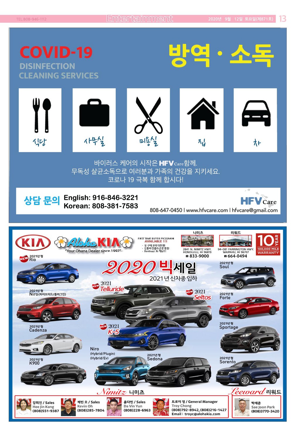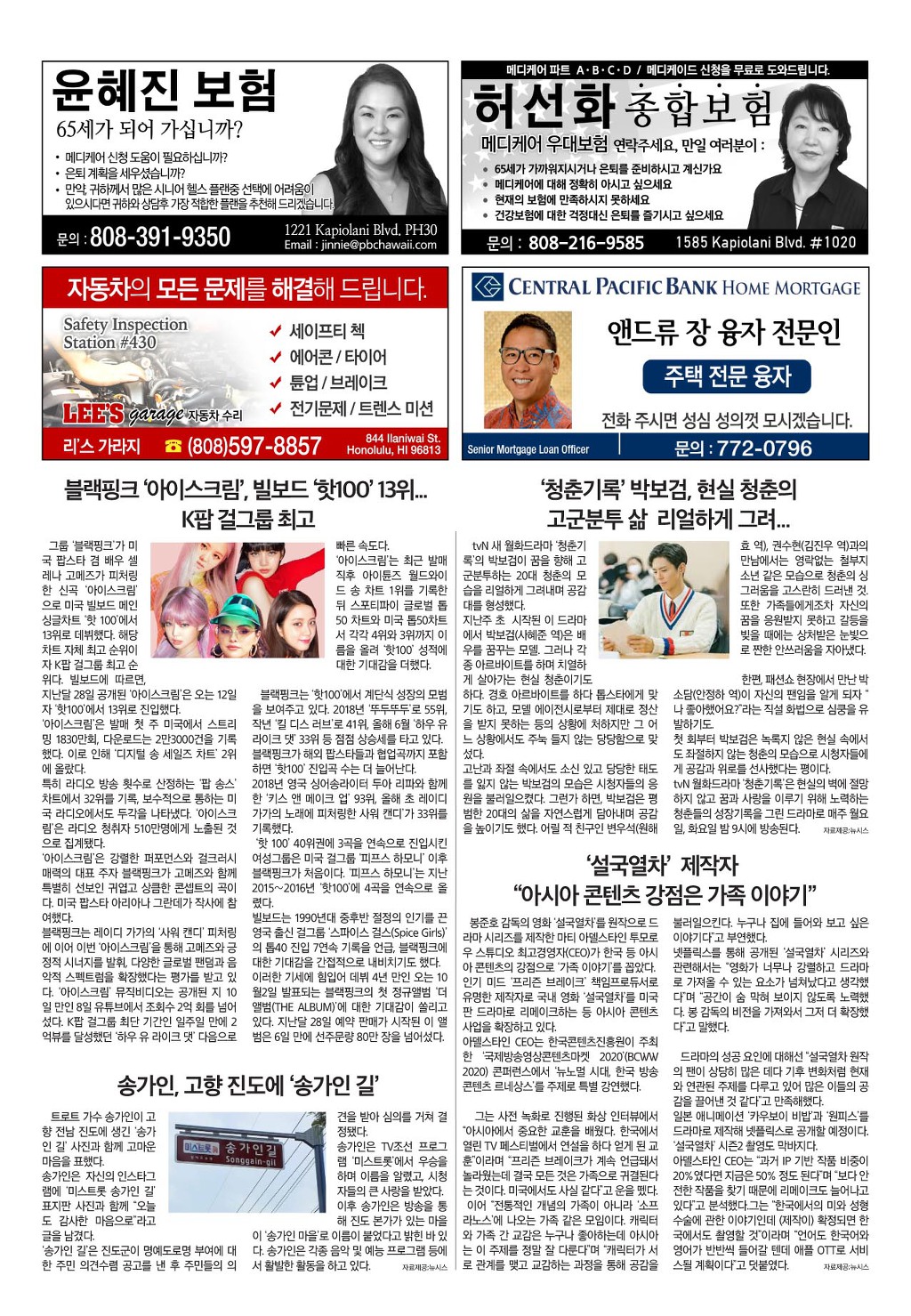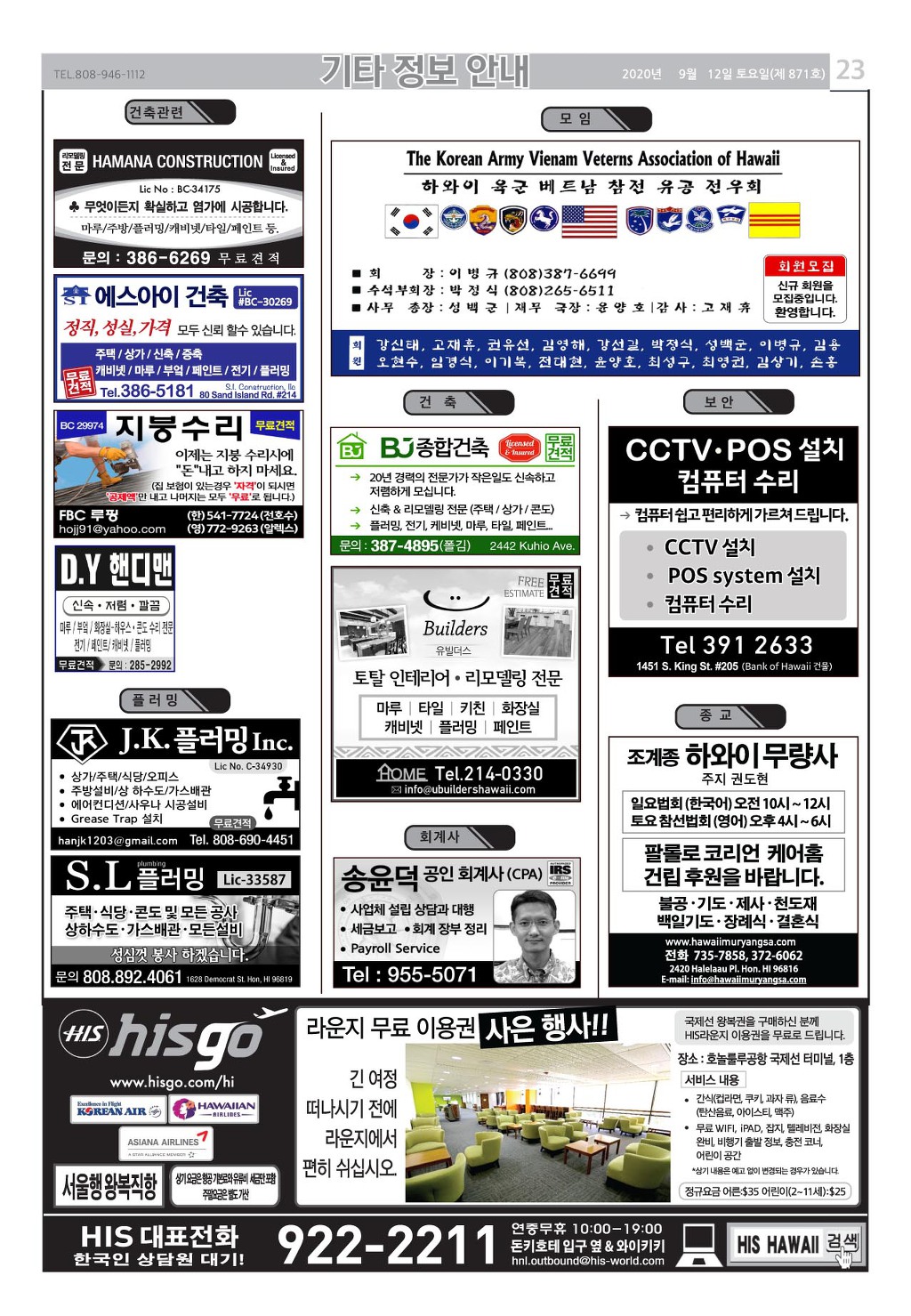 [ 하와이 교차로 :: 2020년 9월 12일(토) ] 구인/구직, 벼룩시장, 렌트(아파트/룸메이트), 부동산, 매매(사업체/자동차), 민박/콘도, 지역광고등..