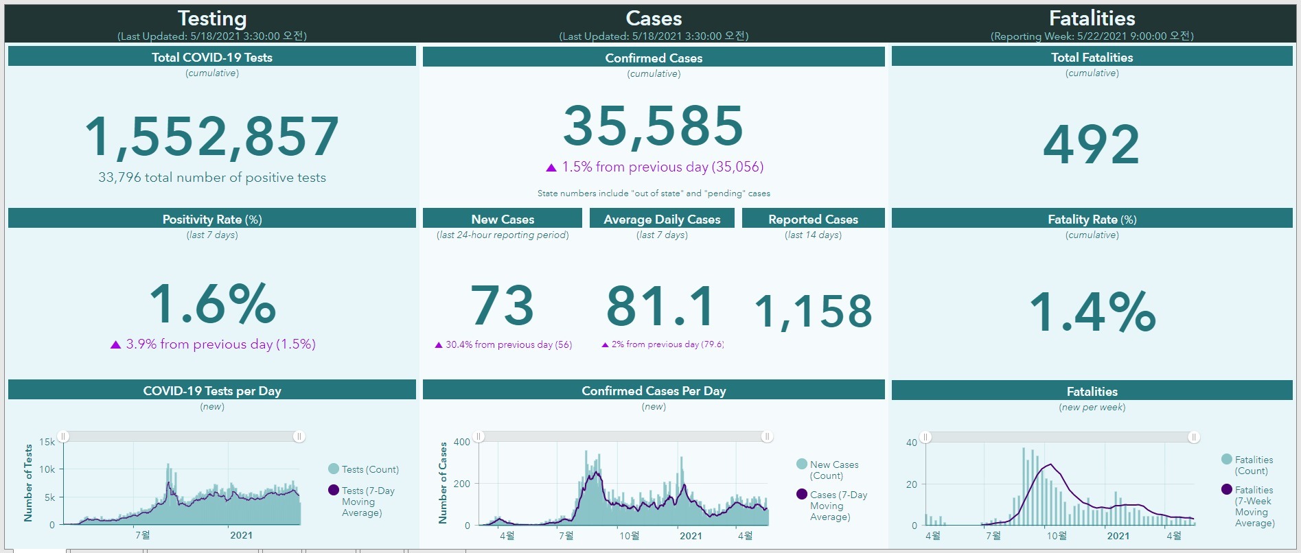 신규확진 73명↑(누적35,585명) / 사망 0명↑(누적492명) / 지난7일간 확진율 1.6% / 누적 사망율 1.5%