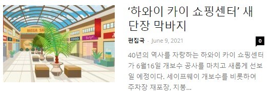 [ 하와이 현지뉴스 :: "한국일보 하와이" ] 2021년 6월 9일까지 - 하와이카이 쇼핑센터 새단장... 작성자동서남북|작성시간21.06.10|조회수111 목록 댓글 0 글자크기 작게가 글자크기 크게가 [ 하와이 현지뉴스 :: "한국일보 하와이" ] 2021년 6월 9일까지 - 하와이카이 쇼핑센터 새단장... 다음검색 현재 게시글 추가 기능 열기 북마크 공유하기 신고 센터로 신고 댓글 댓글 0 댓글쓰기 답글쓰기 댓글 리스트