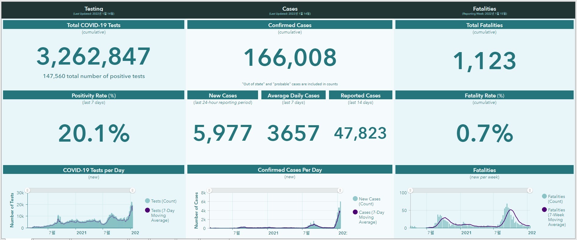 [ 22년 1월 15일 발표 :: 하와이 '코로나19' 방역상황 ] 신규.누적확진 / 최근1주일간 평균 / 확진률 / 사망자수 등..