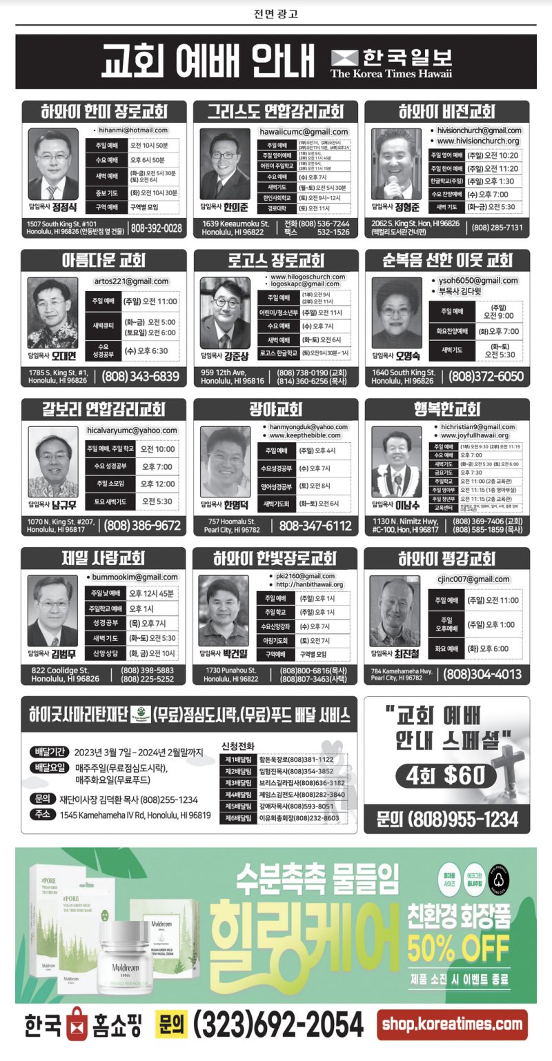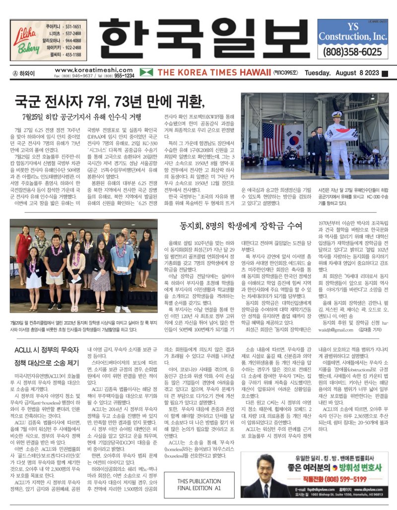 [ 한국일보 - 하와이판 ] 2023년 8월 8일(화) "종이신문"