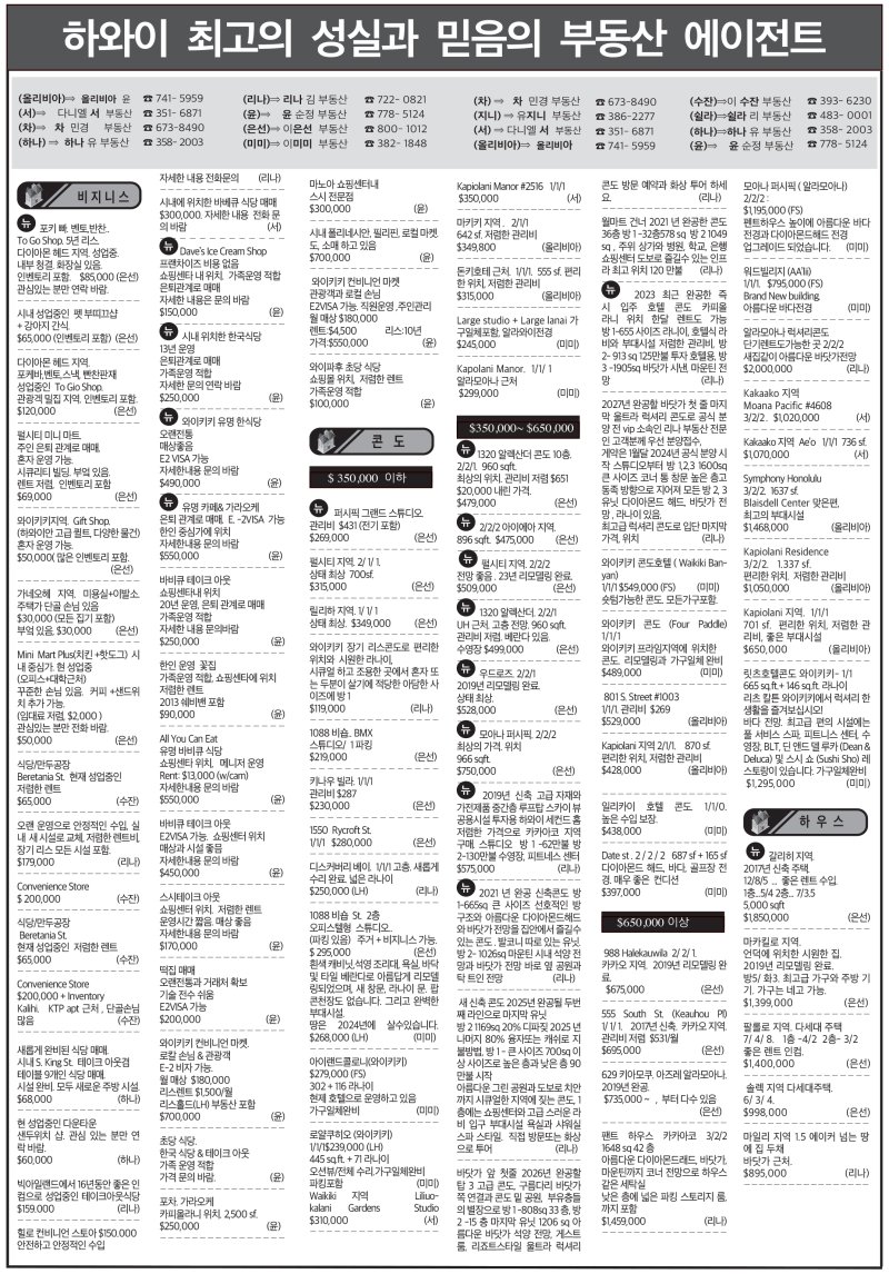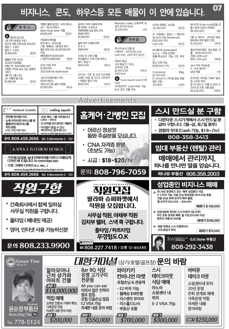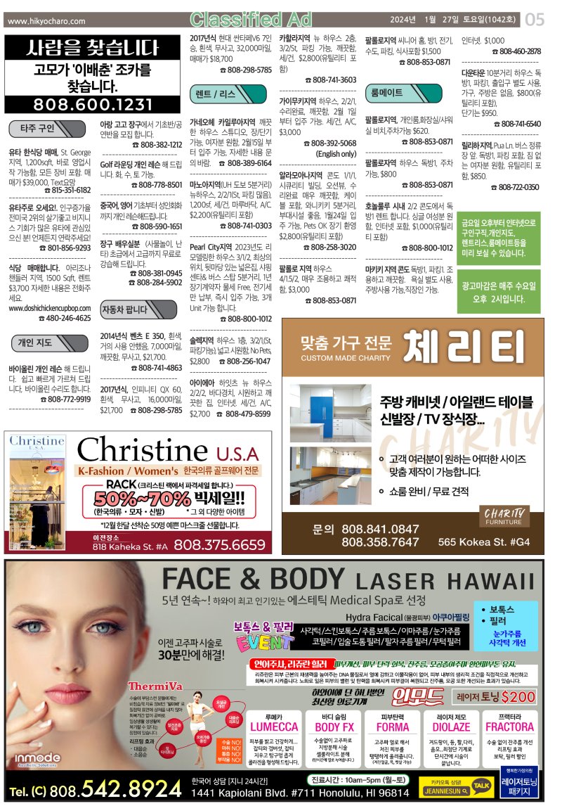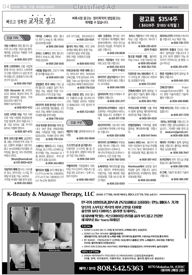 [ 하와이 교차로 :: 2024년 1월 27일(토) ] 구인/구직, 벼룩시장, 렌트, 부동산, 매매, 한인 지역광고등..