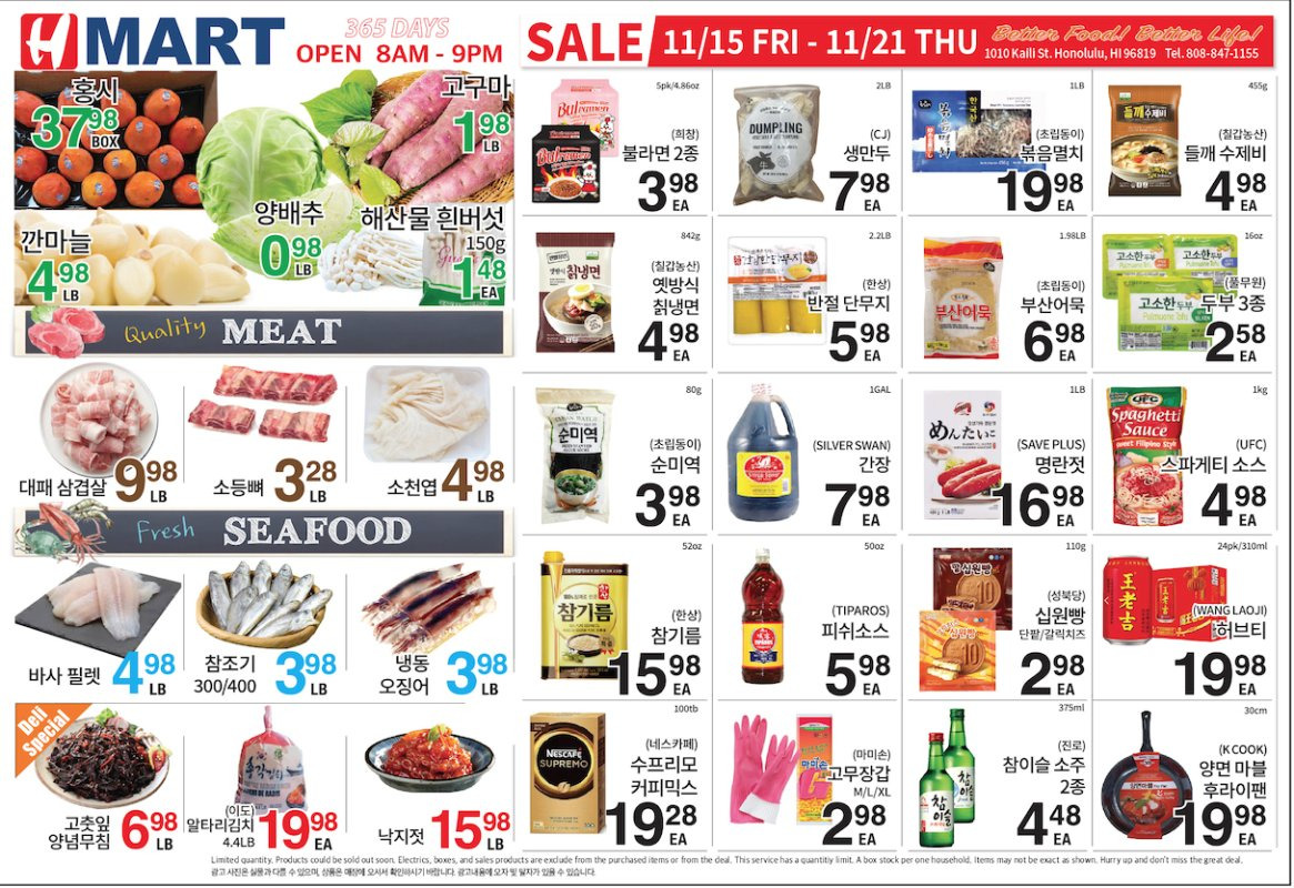 하와이에서 운영되는 H Mart는 총 3곳의 지점이 있는데, 갈리히 지점과 카카아코 및 펄시티 지점은 운영주체가 다르고 세일품목등도 각각 다르니 참고해주시기 바라며, 아래는 갈리히 지점의 정보에 해당합니다.