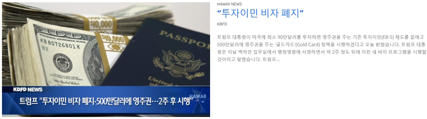 [ 하와이 현지뉴스 :: "KBFD" (한인TV) ] 2025년 2월 25일까지 - “투자이민 비자 폐지” 작성자HI-Jenny|작성시간25.02.26|조회수117 목록 댓글 0 글자크기 작게가 글자크기 크게가 [ 하와이 현지뉴스 :: "KBFD" (한인TV) ] 2025년 2월 25일까지 - “투자이민 비자 폐지” 다음검색 현재 게시글 추가 기능 열기 북마크 공유하기 신고 센터로 신고 댓글 댓글 0 댓글쓰기 답글쓰기 댓글 리스트