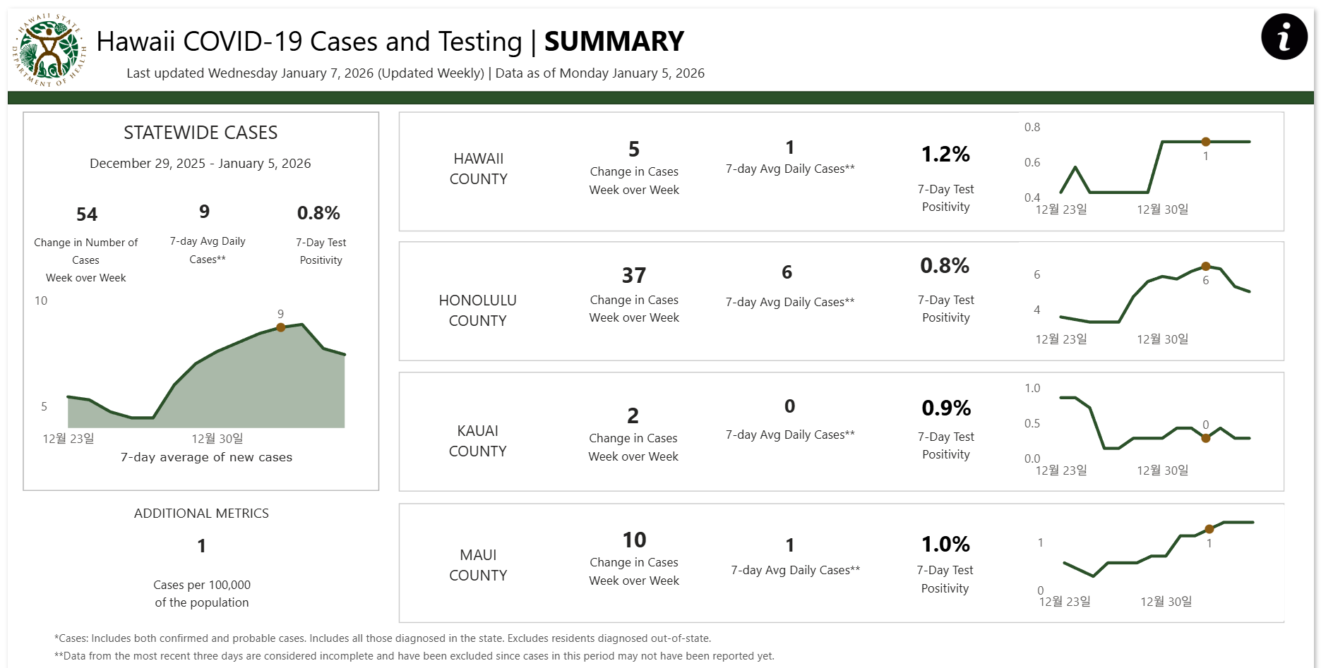 작성자HI-Jenny작성시간26.01.08조회수12 목록 댓글 0[ 하와이 코로나19 '주간' 방역상황 :: 2026년 1월 7일 발표 ]
