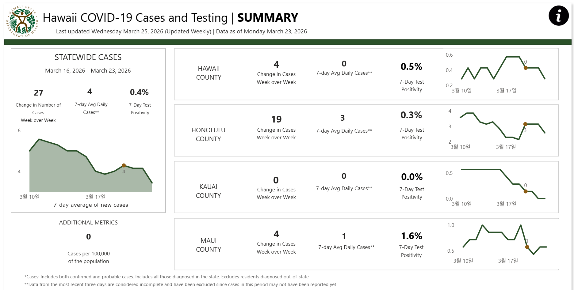 작성자HI-Jenny작성시간26.03.26조회수3 목록 댓글 0[ 하와이 코로나19 '주간' 방역상황 :: 2026년 3월 25일 발표 ]