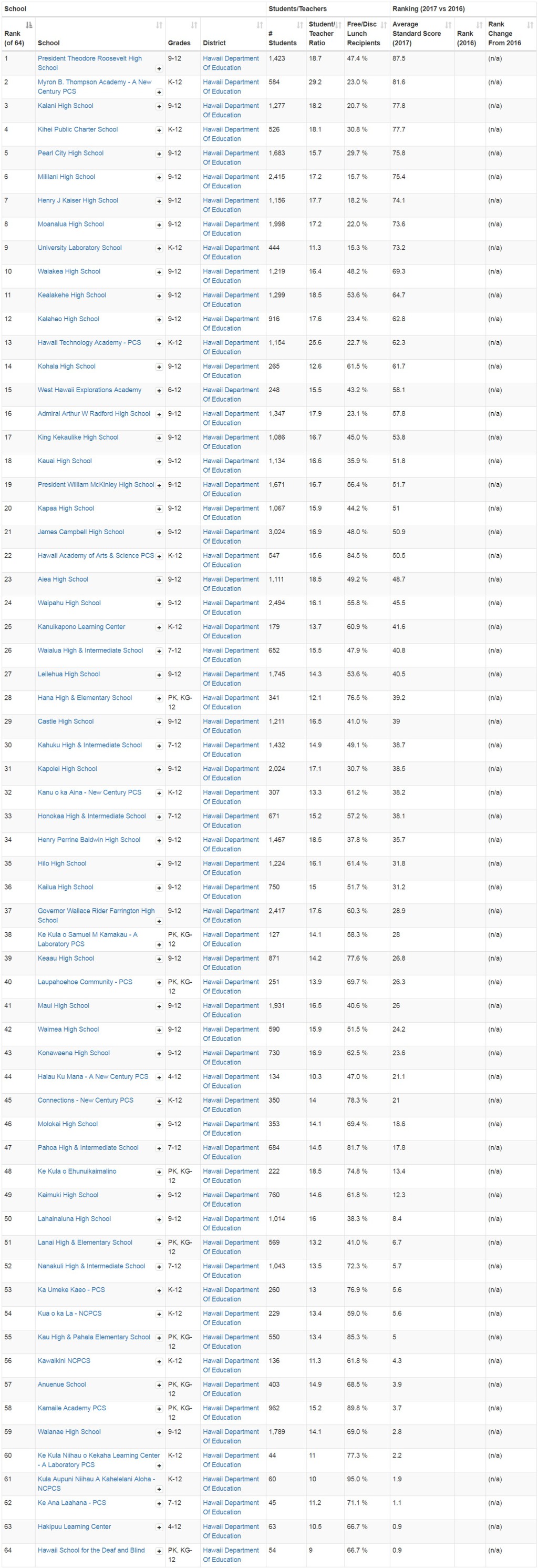 [64개의 하와이 공립 고등학교] 목록은 평가항목에 따른 순위/랭킹 순으로 정렬되었으며, 공신력있는 학교 평가기관에서 확인된 정보들입니다.