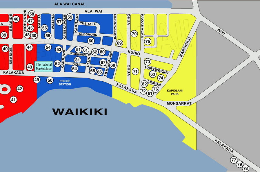 | 01 - Ala Moana Hotel 02 - Hawaii Prince 03 - Ilikai 04 - Marina Tower 05 - Equus 06 - Palms 07 - Inn On The Park 08 - Alana Waikiki 09 - Hawaiian Monarch 10 - Polynesian Plaza 11 - Ramada Plaza 12 - Hilton Hawaiian Village 13 - Ambassador 14 - Royal (Gardens) Hotel 15 - Maile Sky Court 16 - Waikiki Gateway 17 - Luana 18 - Hale Koa Hotel (Military) 19 - Hawaiiana HOTEL CLOSED 20 - Breakers |