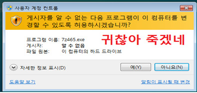 UAC 끄기 (사용자 계정 컨트롤) -- 윈도우 7이나 8의 경우 작성자청수도인|작성시간13.06.17|조회수867 목록 댓글 0 글자크기 작게가 글자크기 크게가 UAC 끄기 (사용자 계정 컨트롤) UAC는 비스타에서도 마찬가지이지만 윈도우 7의 핵심 보안기능이라고 할 수 있습니다. 비스타에서 워낙 호환성 문제를 많이 일으켰기 때문에 윈도우 7에서는 조금 약화시킨다고 들은 것 같은데... 하지만 여전히 저에겐 불편한 존재일 뿐입니다. 보안을 중요시 하는 분들이라면 그냥 두시면 되고 저처럼 고스트 자주 돌리고, 보안에 무감각하고, 귀찮은거 딱 싫어하시는 분들은 UAC를 끄고 사용하시면 되겠습니다 이곳을 눌러도 된다. 끄는 방법은 여러가지가 있으나 그냥 기초적인 방법으로 접근하자면 제어판 - 사용자 계정 및 가족 보호 - 사용자 계정 - 사용자 계정 컨트롤 설정 변 설정하고 재부팅 해주셔야 적용이 됩니다. 이렇게 하면 프로그램 실행할 때 관리자 권한으로 실행하는 것과 동일해집니다. 다음검색 현재 게시글 추가 기능 열기 북마크 공유하기 신고 센터로 신고 댓글 댓글 0 댓글쓰기 답글쓰기 댓글 리스트