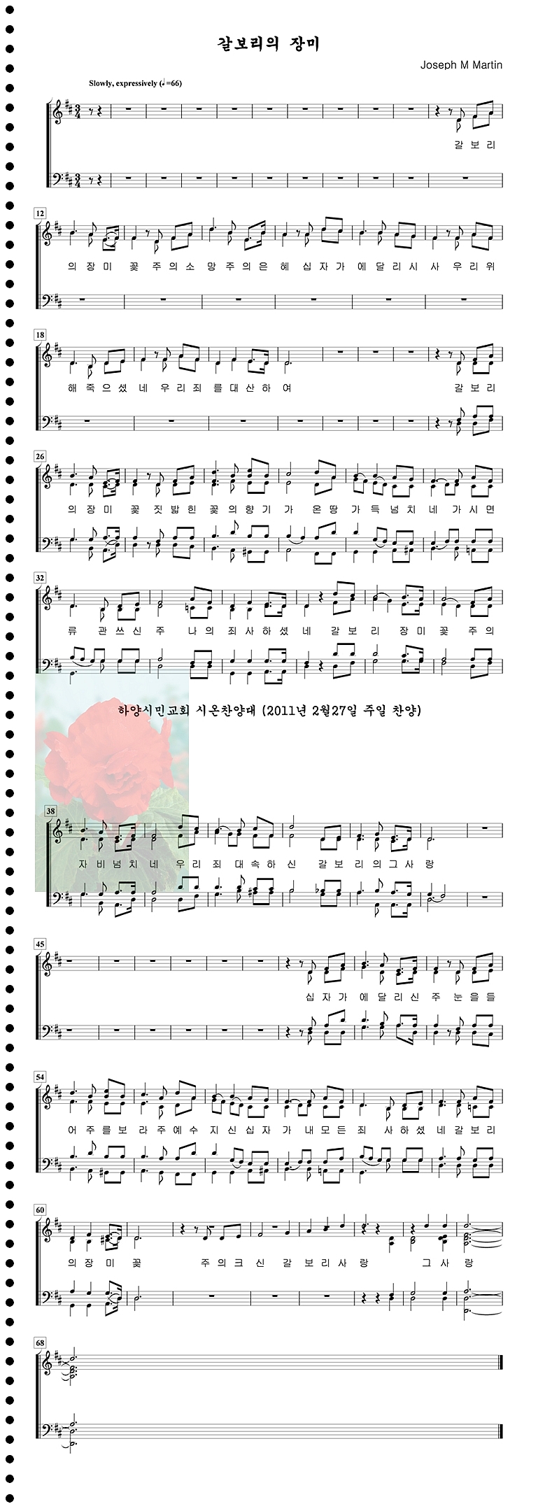 2011년 2월 27일 주일찬양 : 갈보리의 장미 작성자구본주(지휘자)|작성시간11.02.14|조회수134 목록 댓글 4 글자크기 작게가 글자크기 크게가 전체 소프라노 알토 테너 베이스갈보리의 장미꽃 주의 소망 주의 은혜 십자가에 달리시사 우리 위해 죽으셨네 우리 죄를 대신하여갈보리의 장미꽃 짓밟힌 꽃의 향기가 온 땅 가득 넘치네 가시 면류관 쓰신 주 나의 죄 사하셨네갈보리 장미꽃 주의 자비 넘치네 우리 죄 대속하신 갈보리의 그 사랑십자가에 달리신 주 눈을 들어 주를 보라 주 예수 지신 십자가 내 모든 죄 사하셨네 갈보리의 장미꽃주의 크신 갈보리 사랑 그 큰 그 사랑 다음검색 현재 게시글 추가 기능 열기 북마크 신고 센터로 신고 댓글 댓글 4 댓글쓰기 답글쓰기 댓글 리스트 작성자단영♩ | 작성시간 11.02.14 장미 ... ^^ 아름다워요. ^^ 다시한 번 조용히 ~ 작성자윤집♬~ | 작성시간 11.02.14 귀한곡 잘 듣고 갑니다 작성자문희 | 작성시간 11.02.21 집사님 잘 듣고가용 ㅋㅋ 연습 많이 할께요ㅋㅋㅋㅋ 작성자구본주(지휘자) 작성자 본인 여부 작성자 | 작성시간 11.02.25 믿을수 없는 조회수가 ?? ... 댓글 전체보기