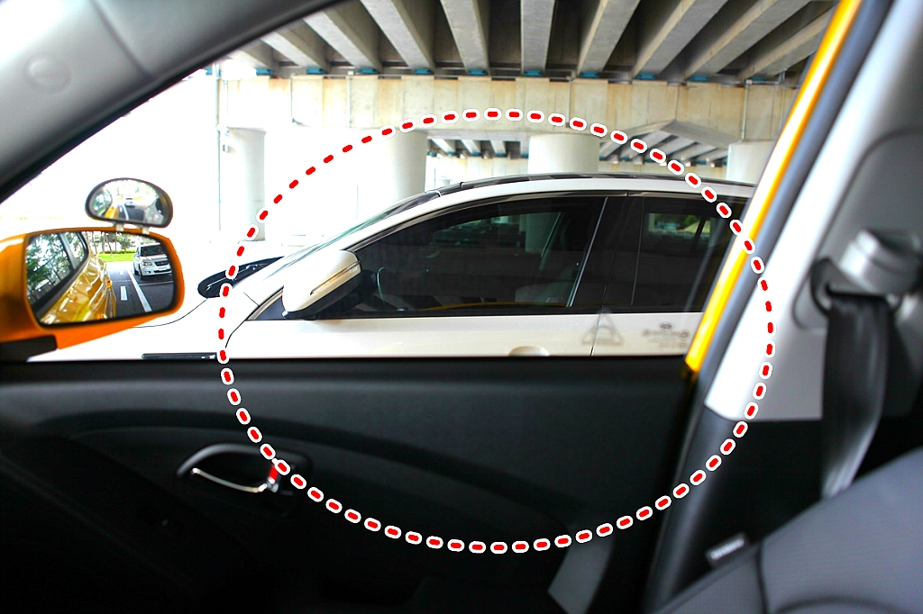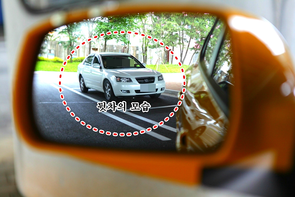 5. 서행으로 후진하시면서 좌측의 빽밀러( 운전석쪽 빽밀러)로 뒷차가 다 보이면 정지합니다