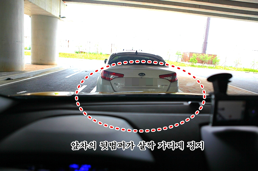 앞차의 범퍼가 살짝 가린 모습으로 정지하시면 대략 1m이상의 앞공간을 만드신겁니다