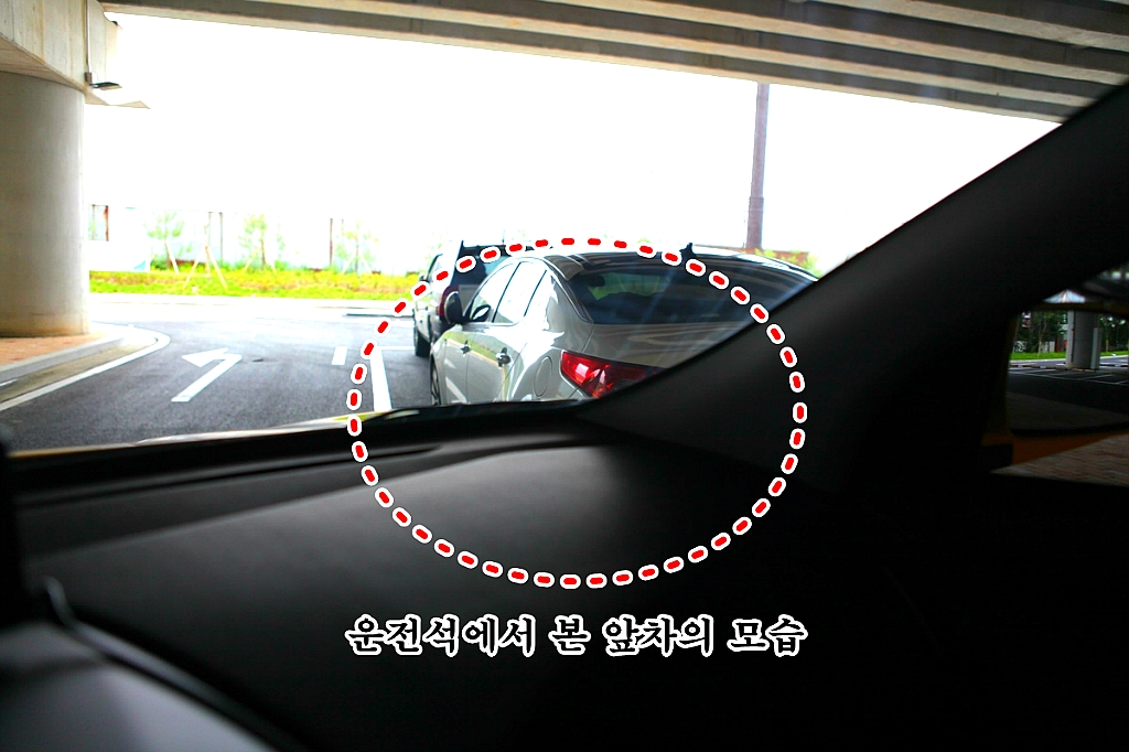 만약 본인차보다 작은 차일 경우는 옆차량과 뒷범퍼가 일치하는것이 좋으므로 조금 앞으로 더 가셔야하고요