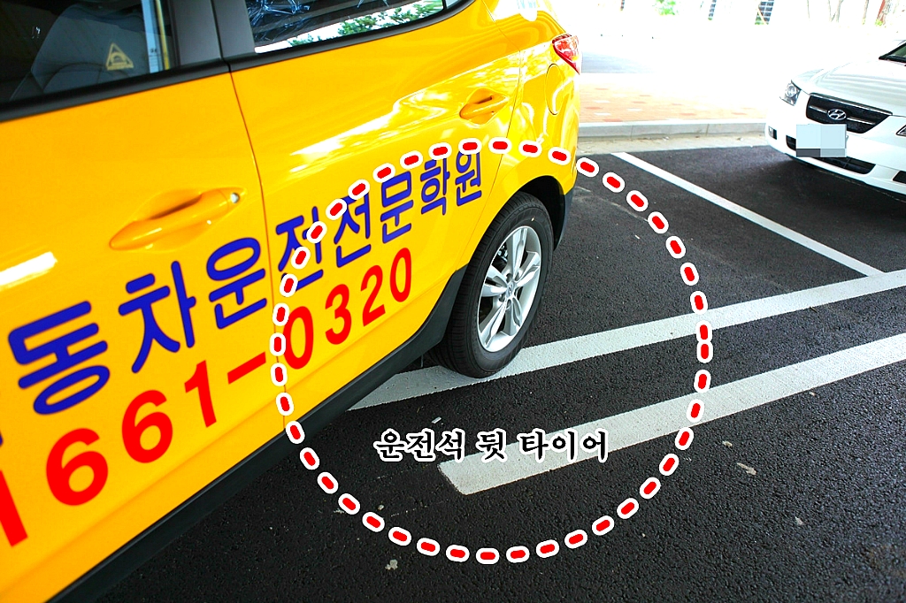 7. 그리고 계속해서 서행으로 후진하시면서 뒷바퀴가 대략 주차라인을 밟았을때 정지합니다