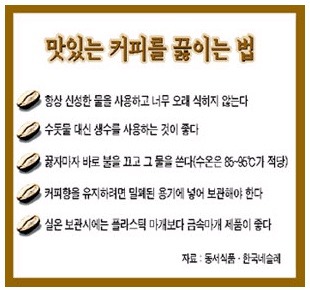 우리가 하루에 섭취하는 카페인의 4분의 3을 커피에서 얻는다. 원두 커피에 가장 많은 카페인(한잔당 1백3~1백12㎎)이 들어 있다.
