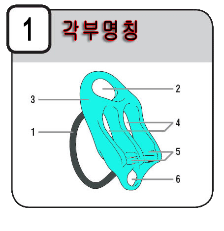 5. 제동톱니 : 빌레이시나, 하강시에 로프에 제동을 가할수있도록 요철로 되어있음.